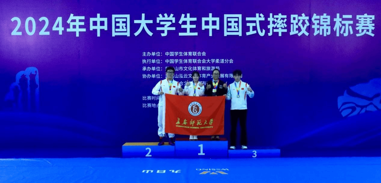 近日,在2024年中国大学生中国式摔跤锦标赛中,我校体育学院代表队在体育学院院长张镜宇和教练员段东平带领下,2022级体育教育专业学生吉洺石获男子甲B组90公斤级冠军,曾渊淏获男子甲B组75公斤级亚军,2024级硕士研究生杨浩祺获男子甲B组90公斤级季军,3名男运动员获男子甲B组团体第二名。赵玉文获女子甲B组60公斤级亚军。我校代表队获体育道德风尚奖。