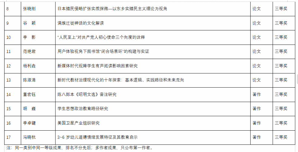我校教师刘钊撰写的《“国民文学”的性别内涵及文学史价值——以近代中国女留学生的文学创作与社会生活为中心》论文获一等奖;薛刚撰写的《清朝中央部院画诺乱象》、郑春颖撰写的《高句丽“鄣曰”新考》等论文获二等奖;董姝娜撰写的咨询报告《关于推动长春市城乡产业融合发展的建议》、姚晓娟著作《燕行录与清代满族印记研究》获二等奖;张晓刚撰写的《日本殖民侵略扩张实质探微—以东乡实殖民主义理论为视角》、谷颖撰写的《满族迁徙神话的文化解读》等论文获三等奖。