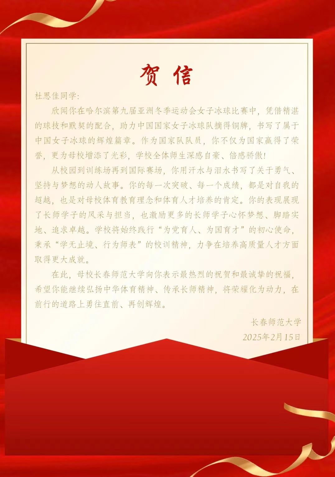 3名优秀的长师学子在亚冬会上为祖国、为家乡、为母校赢得了荣誉,学校全体师生为她们所取得的成就深感骄傲、倍感自豪,第一时间向她们发去贺信,表达最热烈的祝贺和最诚挚的祝福!